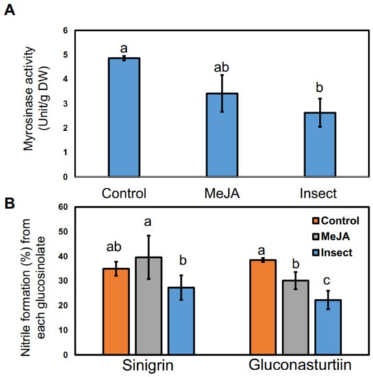 (A) Myrosinase activity (Unit/g DW) and (B) Nitrile formation (%) of control, insect-damaged, and MeJA-treated kale. Nitrile formation (%) is shown as the relative ratio of nitrile to the total concentration of the hydrolysis products formed (sum of isothiocyanates and nitriles) from sinigrin and gluconasturtiin. The data are presented as the mean concentration ± standard error (n = 3). Different letters mean significantly different by Student’s t-test (p < 0.05) across three groups on (a) and three groups within precursor GS on (b), respectively.
