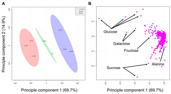 Principle component analysis (A) score and (B) loading plots derived from non-targeted metabolite profiling of Brassica napus with the control plants, MeJA-treated plants, and insect-feeding plants. The shaded areas in (A) represents 95% confidence regions. The pink dots indicated by arrows in (B) represent discriminating biomarkers among various treatments.
