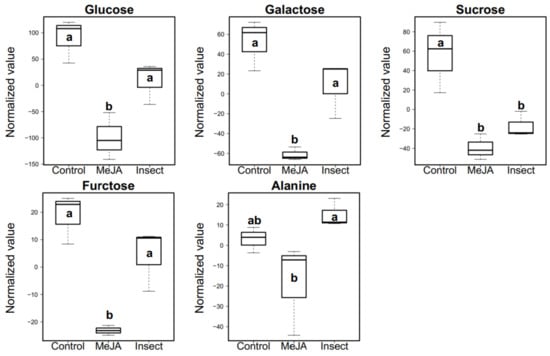 Five biomarker metabolites selected with top-5 variable importance in projection (VIP) scores (VIP > 1.2) from all metabolites among control kales, MeJA-treated kales, and insect-infected kales. Different letter indicates significant differences between the groups, determined by Student’s significance test (p < 0.05). The presented values are normalized values based on an internal standard with auto-scale in Metaboanalyst.