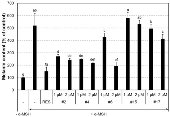 In vitro anti-melanogenic activity of compound #2, #4, #6, #15, and #17. B16F10 cells were cultured in the presence of various compounds at 1 or 2 μM concentration and/or α-MSH at 10 nM for 72 h. Cellular melanin content decreased following treatment with these compounds in a dose-dependent manner. α-MSH, alpha-melanocyte-stimulating hormone (10 nM). RES, resveratrol (10 μM). n = 3; error bars, mean ± SEM. Different alphabetical letters indicate significant differences among the conditions (p < 0.05).