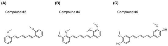 Multiple reports have demonstrated that tyrosinase may be catalytically inhibited by aromatic acids such as benzoic acid and cinnamic acid as well as their derivatives [11,17,18,19]. Furthermore, 1,6-diphenyl-1,3,5-hexatriene and its derivatives are likely to efficiently penetrate into the lipid bilayer in skin because of their hydrophobicity [20]. In addition, Ha and colleagues reported that synthetic compounds containing triene analogs have stronger tyrosinase inhibitory effect than compounds containing benzene analogs [16]. Therefore, compounds #2, #4, and #6, which are 1,6-diphenyl-1,3,5-hexatriene derivatives, may easily cross the lipid bilayer of skin cells, dock to tyrosinase in the melanocytes, and inhibit its activity. However, the mechanism through which these synthetic molecules are metabolized in the melanocytes remains to be further unraveled.