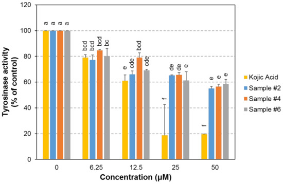 Tyrosinase inhibitory effect of compound #2, #4, and #6. Catalytic activity of the mushroom tyrosinase was measured in the presence of each compound at various concentrations (0, 6.25, 12.5, 25, and 50 μM). Kojic acid, a well-known tyrosinase inhibitor, was used as a positive control. n = 3; error bars, mean ± SEM. Different alphabetical letters indicate significant differences among the conditions (p < 0.05).