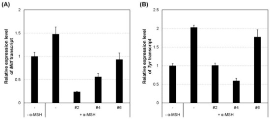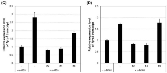 The effects of the selected compounds on the expression of mRNA encoding melanogenic factors were evaluated in α-MSH-stimulated B16F10 cells. Total mRNAs were extracted from the cells treated with α-MSH in the absence or presence of each compound. The mRNA levels of tyrosinase (Tyr), tyrosinase-related protein 1 (Tyrp1), Tryp2, and microphthalmia-associated transcription factor (Mitf) were quantified by real-time PCR (Figure 5). The mRNA levels of Tyr, Tyrp1, Tryp2, and Mitf induced by α-MSH were effectively suppressed in the presence of compounds #2 and #4.