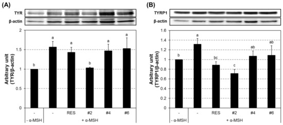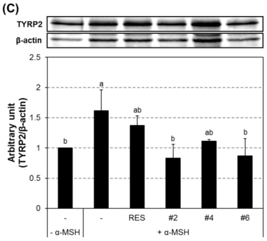 Melanogenic protein expression in the compound-treated B16F10 cells. The cells were treated with the indicated compound at 2 μM concentration for 24 h. Relative protein expression levels of cytoplasmic TYR (A), TYRP1 (B), and TYRP2 (C) were determined by western blot analysis. α-MSH, alpha-melanocyte-stimulating hormone (10 nM); RES, resveratrol (10 μM); TYR, tyrosinase; TYRP1, tyrosinase-related protein 1; TRYP2, tyrosinase-related protein 2. n = 3; error bars, mean ± SEM. Different alphabetical letters indicate significant differences among the conditions (p < 0.05).