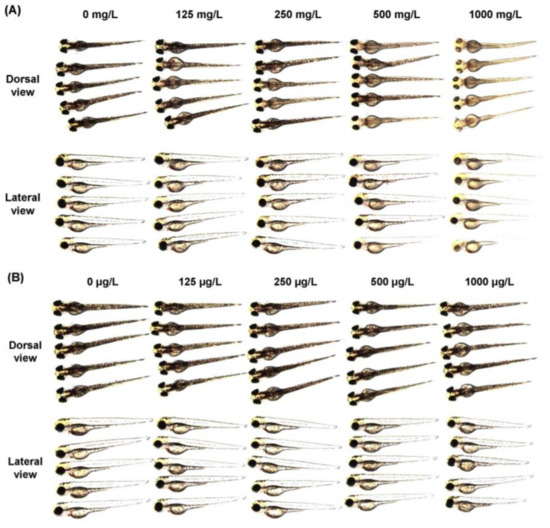 - Choi, J.S.; Kim, R.O.; Yoon, S.; Kim, W.K. Developmental toxicity of zinc oxide nanoparticles to zebrafish (Danio rerio): A transcriptomic analysis. PLoS ONE 2016, 11, e0160763. [Google Scholar] [CrossRef] [PubMed]