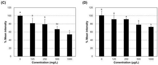 The study was conducted in accordance with the guidelines of the Institutional Animal Care and Use Committee of the Korea Institute of Toxicology, Daejeon, Korea (permission number: 1604-0112; approved on 2 April 2017). Wild-type adult zebrafish (6–24-month-old) were cultured at the Systems Toxicology Research Center, Korea Institute of Toxicology. These were maintained under standard conditions (carbon-filtered dechlorinated tap water at 27 ± 1 °C with 14/10 h light/dark cycle), as previously described [34,35]. To test the anti-melanogenic effect of the selected compounds, the embryos were collected and exposed to the compounds at designated concentrations (0, 125, 250, 500, and 1000 μg/L). After 72 h of incubation, pigment development in zebrafish was observed under a microscope (Leica M205 FA, Leica, Wetzlar, Germany). Arbutin was used as a positive standard at concentrations of 0, 125, 250, 500, and 1000 mg/L. The obtained images of pigment area density were quantitatively analyzed using ImageJ software, 1.48v (developed at the National Institutes of Health), and normalized to those of the control