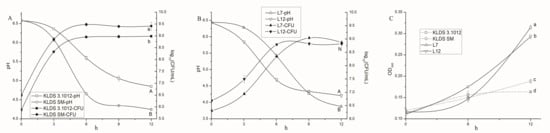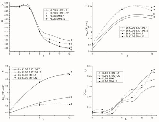 A rapid pH decline started at ~3 h in the four samples of S. thermophilus and Lb. bulgaricus, but ended at different times. KLDS SM displayed faster acid production and growth rate than KLDS3.1012. The acid production rate of L12 was faster than L7 before 9 h but decreased subsequently, while L7 kept acid production until pH 3.88. Similarly, the growth of L12 was faster than L7 before 6 h, but no significant difference (p > 0.05) was found at 12 h between the two strains.