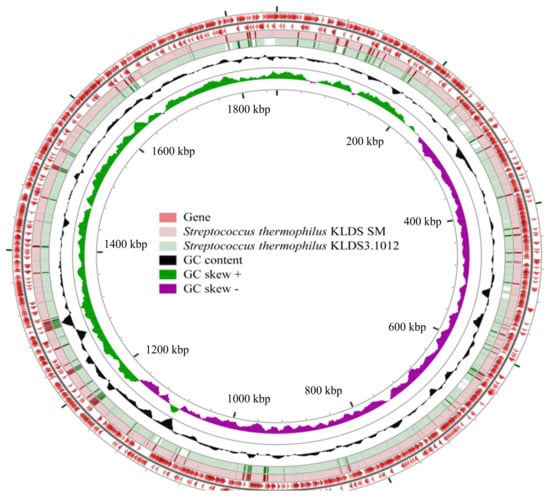 The genomic DNAs of the various strains used in this study were extracted using the TIANGEN TIANamp bacteria DNA kit (DP302) following the manufacturer’s instruction. The details of S. thermophilus KLDS SM genome sequencing, assembly and annotation were described by our previous report []. The genome of S. thermophilus KLDS3.1012 was sequenced by using the combining strategy of Illumina Hiseq (2 × 100 bp paired-end libraries, Illumina, San Diego, CA, USA) and Illumina Miseq (2 × 250 bp paired-end libraries) platform. Subsequently, 933 M Hiseq and 256 M Miseq clean data were produced through quality control and data filter. All the clean data were de novo assembled by SOAPdenovo2.0 []. Genome annotation was executed by NCBI Prokaryotic Genome Annotation Pipeline (Available online: http://www.ncbi.nlm.nih.gov/books/NBK174280). WebMGA (Available online: http://weizhong-lab.ucsd.edu/metagenomic-analysis/server/cog/) was used for COG annotation []. Circular genome map was generated by CGView Server []. ISfinder and IslandView4 were used for the identification of transposase and genomic island in the genome, respectively [,]. The functional regions were analyzed by Pfam 31.0 with an E-value of 1.0 [].
