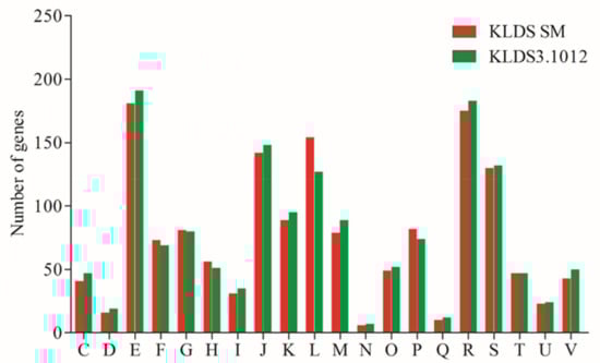 COG functional classification of protein-coding gene in S. thermophilus KLDS SM and S. thermophilus KDLS3.1012 genome. C: Energy production and conversion; D: Cell cycle control, cell division, chromosome partitioning; E: Amino acid transport and metabolism; F: Nucleotide transport and metabolism; G: Carbohydrate transport and metabolism; H: Coenzyme transport and metabolism; I: Lipid transport and metabolism; J: Translation, ribosomal structure and biogenesis; K: Transcription; L: Replication, recombination and repair; M: Cell wall/membrane/envelope biogenesis; N: Cell motility; O: Posttranslational modification, protein turnover, chaperones; P: Inorganic ion transport and metabolism; Q: Secondary metabolites biosynthesis, transport and catabolism; R: General function prediction only; S: Function unknown; T: Signal transduction mechanisms; U: Intracellular trafficking, secretion, and vesicular transport; V: Defense mechanisms.