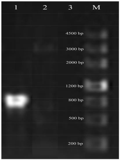 Electrophoresis of prtS gene in S. thermophilus. Lane 1: S. thermophilus KLDS SM; Lane 2: S. thermophilus KDLS3.1012; Lane 3: negative control without the template DNA and Lane M: marker.