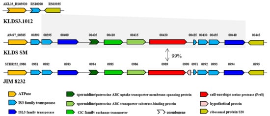 The genomic islands of S. thermophilus KLDS SM were found by IslandViewer4. There are 15 genomic islands in the genome of S. thermophilus KLDS SM (Supplementary Materials Table S1), while the prtS gene (A9497_00420) is not located in any genomic islands. Comparative genomic analysis of S. thermophilus KLDS SM and S. thermophilus KLDS3.1012 illustrates that S. thermophilus KLDS SM owns a 15 kb specific region between the gene encoding ATPase and the gene encoding ribosomal protein S20 (Figure 5). It consists of the prtS gene and three genes potC (truncated), potD and eriC encoding a spermidine/putrescine ABC uptake transporter membrane-spanning protein, a spermidine/putrescine ABC transporter substrate-binding protein, and a ClC family exchange transporter, respectively. These genes are surrounded by IS elements of the IS3 family and ISL3 family, which bring about the emergence of horizontal gene transfer (HGT). Although one IS3 transposase was presented in the genome of S. thermophilus KLDS3.1012, it is a frameshifted pseudogene without the function of transposon.