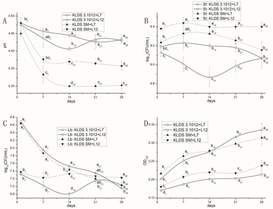 Four different types of mixed cultures were investigated in this study: (i) KLDS3.1012-L7; (ii) KLDS3.1012-L12; (iii) KLDS SM-L7; (iv) KLDS SM-L12. The combinations were inoculated into skimmed milk at a 1:1 ratio (1 × 106:1 × 106 CFU·mL−1), and cultivated at 42 °C for 12 h in the fermentation phase. The changes in pH, viability of bacterial strains and proteolysis were monitored as described by []. For the cold storage phase, the four combinations were first fermented until pH 4.5, and then transferred to 4 °C for 28 days. Afterwards, samples were analyzed for changes in pH, viability, and proteolysis at 1, 7, 14, 21, and 28 days of storage at 4 °C [].