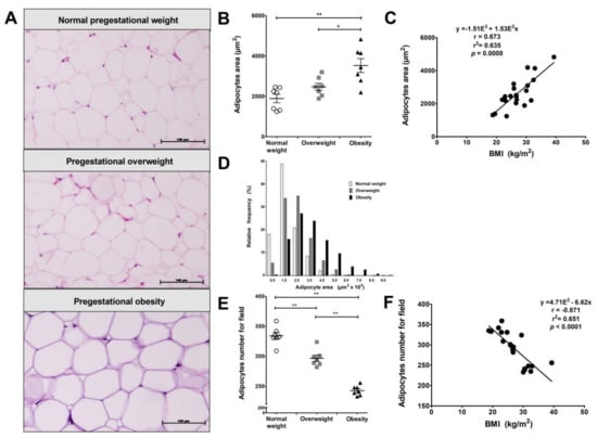 In the present study, we describe the morphologic features of adipocytes present in VAT from pregnant women. We were able to determine a direct correlation with changes in size and number depending on pregestational weight. Our results show that VAT adipocyte hypertrophy and reduction in the number of these cells at the end of pregnancy correlate with being overweight or obese in the pregestational period. It is important to note that in the overweight state, there is moderated hypertrophy as the severity of this condition increases with BMI. Adipocyte hypertrophy may be associated with a higher degree of inflammation in these groups of women. This may lead to adverse perinatal outcomes, such as glucose intolerance and insulin resistance, as has been demonstrated in previous reports using pregnant mice models [,]. Our findings are similar to those reported by Haghiac et al., which described that adipocytes from obese pregnant women are larger than those from lean pregnant women, although these authors analyzed abdominal subcutaneous fat []. Regarding animal models, Zhang et al. 2011 showed that adipocytes obtained from subcutaneous and parametrial adipose tissue in lean pregnant mice are larger than those from lean non-pregnant mice, concluding that adipocyte hypertrophy is dependent on pregnancy []. The strong correlation of BMI with adipocyte size and number found in our study suggests that hypertrophy depends on weight rather than pregnancy state, even though we did not evaluate non-pregnant women.