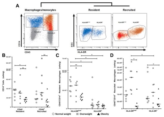 On the other hand, the analysis in the recruited subsets showed that the number of HLA-DRlow/− macrophages was higher compared to the number of HLA-DR+ macrophages in the overweight group (p < 0.05). No differences in the proportion of recruited macrophage subsets were found in the other study groups. The intergroup analysis demonstrated that obese women had significantly lower recruited HLA-DRlow/− and HLA-DR+ macrophages compared to overweight and lean women, respectively (p < 0.01; Figure 2D).