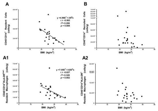 Resident HLA-DRlow/− macrophage subset decreases with BMI. Spearman correlation between (A) resident and (B) recruited CD14+ cells as well as (A1,A2) resident macrophage subsets. The number of resident cells (CD45−CD14+) (A) and CD45− CD14+HLA-DRlow/− (A1) cells decreases as BMI increases (p < 0.01, r = 0.627; p < 0.01, r = 0.562).