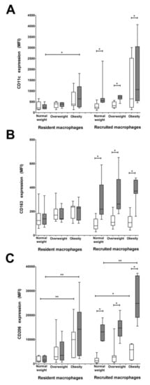3.4. CD206 and CD11c Surface Expression Is Higher in Recruited and Resident Macrophages from Women with Pregestational Obesity