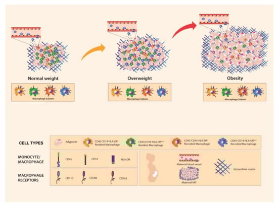 Human VAT is constituted by adipocyte and non-adipocyte cells, such as endothelial cells, fibroblasts, preadipocytes, and several immune cells, such as macrophages []. It has been demonstrated that cross-talk is established between them and regulates tissue functionality at different levels [,]. Moreover, macrophages seem to play a leading role in the inflammatory response elicited by this tissue in obesity [,]. Some studies have characterized macrophage populations and composition using different sources of adipose tissue, which is mostly related to extreme degrees of obesity. This showed that a high infiltration of pro-inflammatory macrophages, especially in VAT, strongly correlates with a local and systemic inflammatory environment [,,,]. Haghiac et al. reported a higher number of macrophages in subcutaneous adipose tissue from obese pregnant women compared to lean pregnant women, which was correlated with an inflammatory state and higher release of cell-free DNA in the obese group []. However, this study lacks a characterization of macrophage populations and does not include an overweight women group as a previous state to obesity. All findings are summarized in Figure 5.