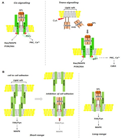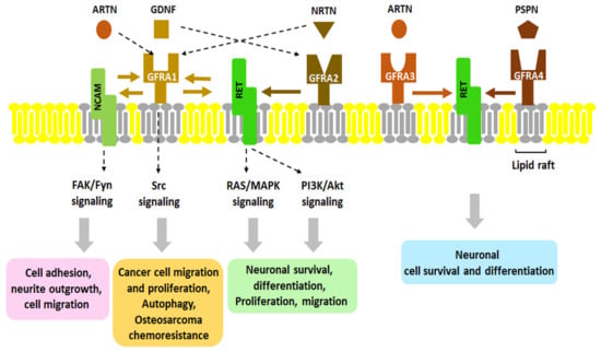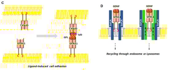 - Paratcha, G.; Ledda, F.; Baars, L.; Coulpier, M.; Besset, V.; Anders, J.; Scott, R.; Ibanez, C.F. Released GFRalpha1 potentiates downstream signaling, neuronal survival, and differentiation via a novel mechanism of recruitment of c-Ret to lipid rafts. Neuron 2001, 29, 171–184. [Google Scholar] [CrossRef]