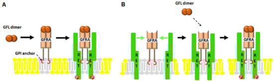 - Paratcha, G.; Ledda, F. GDNF and GFRalpha: A versatile molecular complex for developing neurons. Trends Neurosci. 2008, 31, 384–391. [Google Scholar] [CrossRef] [PubMed]