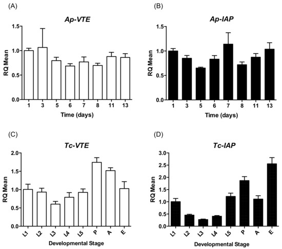 Expression of V-ATPase subunit E (VTE, shown in white column) and inhibitor of apoptosis (IAP, shown in black column) genes throughout the life cycle of (A,B) A. pisum (Ap) and (C,D) T. castaneum (Tc) by quantitative PCR. For Ap, day 1 corresponds to the nymphal stage with analysis following development at days specified until the onset of nymph production at day 13. Developmental stages for Tc are L1 = 1st–2nd instar, L2 = 2nd–3rd instar, L3 = 3rd–4th instar, L4 = 4th–5th instar, L5 = 5th–6th instar (pre-pupal stage), P = pupa, A = adult, E = egg. RQ set to 1.0 for Day 1 or L1 samples. Error bars depict ±SD of the mean for 3 technical replicates (n = 5 insects or 30 mg eggs per replicate).