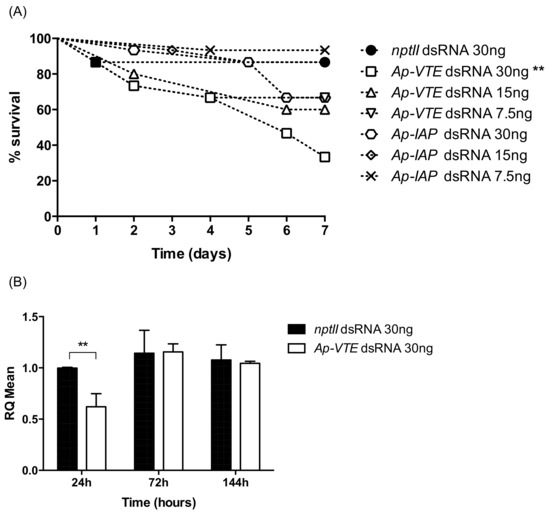 (A) Aphid survival after injection of Ap-VTE or Ap-IAP dsRNAs (n = 15 per treatment). (B) Relative expression of Ap-VTE mRNA in injected aphids. RQ set to 1.0 for nptII control 24 h treatment. Error bars indicate the ±SD of the mean from two independent biological replicates (n = 5 insects per treatment), each with three technical replicates. Asterisks depict significant differences ** p < 0.01 in survival or mean mRNA levels, as compared to controls.