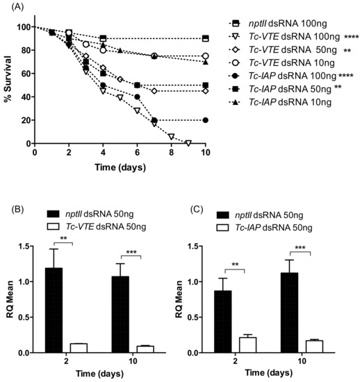 Pre-pupal T. castaneum larvae injected with VTE or IAP dsRNA exhibited similar dose dependent reductions in survival over an assay period of 10 days (Figure 3A). At the highest dose of 100 ng (equivalent to 34.4 ng dsRNA/mg larvae) 100% and 80% mortality was recorded respectively, for VTE and IAP injected insects (p < 0.01; ANOVA Log-rank Mantel Cox tests). Effects on survival were also significant, as compared to the control treatment, at the lower 50 ng injection dose where approx. 50% mortality was recorded for both dsRNA treatments.