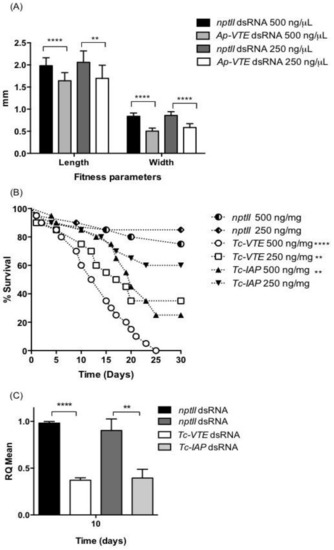 On the basis of injection assays, VTE dsRNA was selected for oral delivery to aphids. Neonate aphids were fed on diet containing 250 ng/µL Ap-VTE dsRNA for 12 days, with fresh diet provided every 48 h. Survival was 100% for aphids fed on target and control dsRNAs, although aphids feeding on VTE dsRNA containing diets were visibly smaller than the control group. The ability of aphids to grow on dsRNA containing diets was assessed by measuring the length and width of individual aphids (n = 15 per treatment). As shown in Figure 5A, aphids fed Ap-VTE dsRNA at 500 and 250 ng/µL diet showed significant reductions in both length and width as compared to controls aphids fed with nptII dsRNA (p < 0.0001; student t-tests). Analysis by qPCR showed no significant down-regulation of target mRNA levels in aphids fed on diets containing Ap-VTE dsRNA at 500 and 250 ng/µL, as compared to controls.