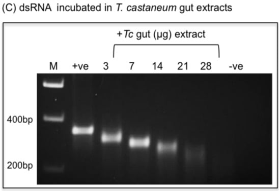 The stability of dsRNA to degradation in T. castaneum guts was further investigated by incubating dsRNA (200 ng) for 30 min in the presence of increasing amounts of gut extract which, as shown in Figure 6C, was found to result in the appearance of dsRNA fragments of decreasing size. These results indicated that exonuclease activity was prevalent in T. castaneum gut extracts as opposed to endonuclease activity in A. pisum.