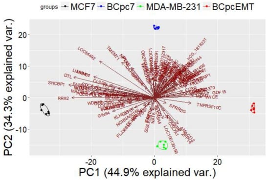 Principal component analysis considering gene signature shared in two breast cancer immortalized cell lines (MCF7 and MDA-MB-231) and in two BC primary cell cultures (BCpc7 and BCpcEMT).
