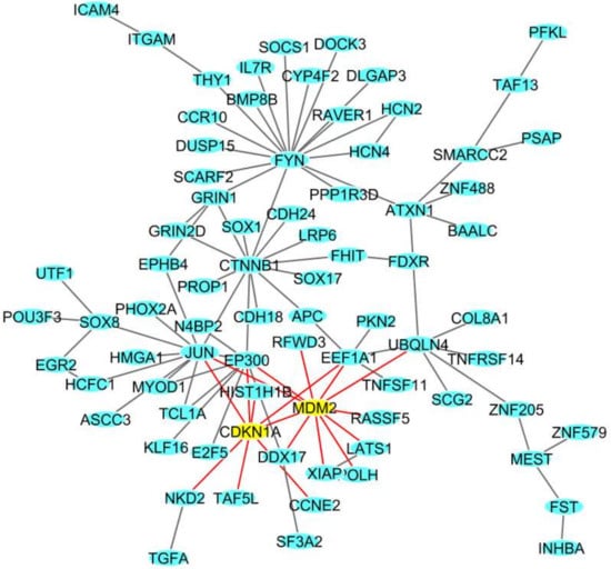 In MCF10 cells, among the total 560 DEGs (Table 1), we identified a network of 78 DEGs (Figure 2). Among these DEGs we found CDKN1A, involved in cell cycle progression and whose expression is controlled by p53, and MDM2, which is involved in the DNA damage pathway [].