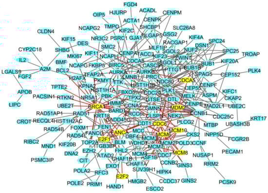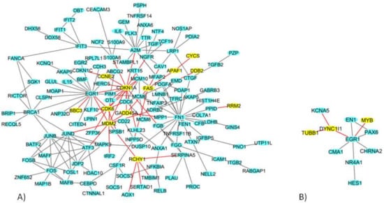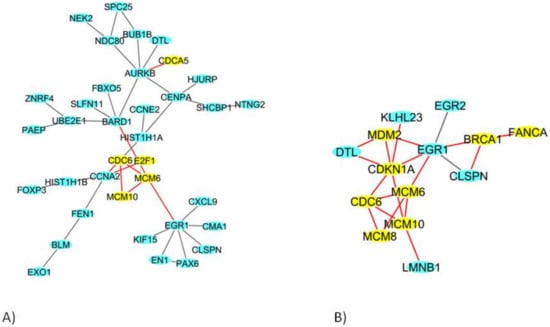 In these networks, we found genes involved in transcription (E2F1, E2F2), in the cell cycle (CDCA5, CDC6), in DNA replication (MCM6, MCM8, MCM10), in DNA repair (BRCA1, FANCA), and in DNA damage (MDM2, CDKN1A).