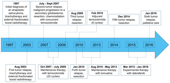 At the age of 9 years, an anaplastic astrocytoma (grade III according to the World Health Organization (WHO) classification of the central nervous system) in the left temporoparietal region of a male patient was diagnosed histologically. First-line therapy consisted of interstitial brachytherapy using 125I-seeds and external boost radiotherapy. During the further course of the disease over many years, multiple tumor relapses occurred and numerous treatment options were used. A detailed treatment overview is depicted in Figure 1.