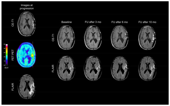 In December 2014, Magnetic Resonance Imaging (MRI; left column) shows a contrast-enhancing lesion and an enlarged FLAIR hyperintensity in the left temporoparietal lobe. The corresponding Positron-Emission-Tomography (PET) scan using O-(2-18F-fluoroethyl)-l-tyrosine (FET) depicts increased metabolic activity in spatial correlation with the contrast enhancement. MR and PET images are consistent with tumor progression. Compared to baseline MRI, follow-up (FU) MRI findings (right rows) during dabrafenib therapy remain unchanged until the tumor progression ten months after dabrafenib initiation.