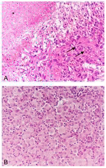 (A) In 2007, the second recurrence of the tumor exhibited microvascular proliferation (arrows) and necrosis (asterisk), thus, corresponding to a glioblastoma (WHO grade IV). (B) In 2014, the fifth recurrence of the tumor was dominated by epithelioid differentiated glial tumor cells, thus, corresponding, to epithelioid glioblastoma (WHO grade IV). (A,B) hematoxylin and eosin staining; original magnification ×400.