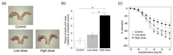 Plaque formation in aortic arch of ApoE KO mice. (a) Representative images of aortic arch stained with oil red-O solution and (b) plaque area in aortic arch of ApoE KO mice exposed to CS. Quantitative data are expressed relative to the values of the control group. Data are mean ± SEM of six animals per group; (c) Cumulative acetylcholine-induced relaxation in aortic rings from ApoE KO mice exposed to CS. Data are mean ± SEM of four-six animals per group. * p < 0.05 versus the high-dose group.