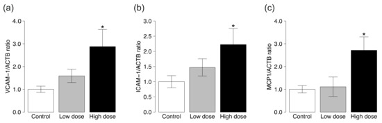 Next, we tested the effects of CS on the expression of vascular cell adhesion molecule-1 (VCAM-1), intercellular adhesion molecule-1 (ICAM-1), and monocyte chemotactic protein 1 (MCP1). The expression levels of VCAM-1 and ICAM-1 mRNA were significantly higher in the thoracic aortas of ApoE KO mice exposed to high-dose, but not low-dose, CS compared to the control group (Figure 2a,b). Likewise, the expression level of MCP1 mRNA was higher in ApoE KO mice exposed to CS at the high dose, but not to low-dose CS, compared to the control group (Figure 2c).