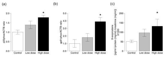Since NADPH oxidase is a major source of reactive oxygen species (ROS) in cardiovascular cells including vascular smooth muscle cells and endothelial cells, we measured the expression levels of components of the membrane-associated enzyme phagocyte NADPH oxidase. The abundance of p22phox and gp91phox mRNAs in the thoracic aortas was significantly greater in ApoE KO mice exposed to high-dose CS than the control group (Figure 3a,b). Exposure to high-dose CS increased the expression levels of p47phox and p67phox mRNAs, but there were no statistically significant differences in the expression levels of these mRNAs between the groups (Figure S2a,b). Exposure to low-dose CS did not affect the expression levels of all examined mRNAs.
