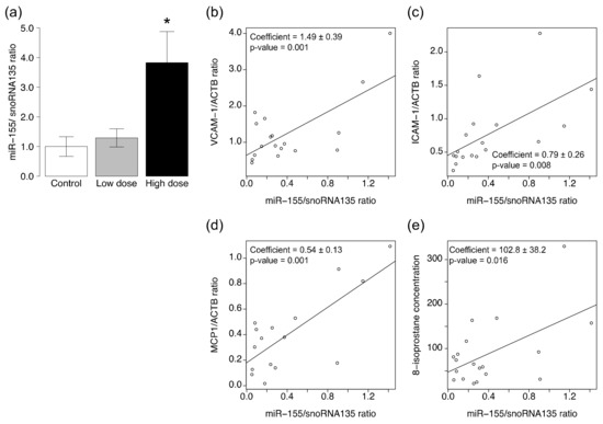 The expression level of miR-155 was significantly higher in the aortic tissues of ApoE KO mice exposed to high-dose CS compared with the control group (Figure 4a). The expression level of miR-126 tended to be lower (Figure S3a) and that of miR-21 tended to be higher in ApoE KO mice exposed to high-dose CS than the control group (Figure S4a), albeit statistically insignificant. Exposure to low-dose CS did not affect the expression level of three miRNAs in the aortas of ApoE KO mice. Regression analyses showed significant correlations between miR-155 level and VCAM-1/ACTB ratio (p = 0.001, r = 0.69), ICAM-1/ACTB ratio (p = 0.008, r = 0.61), MCP1/ACTB ratio (p = 0.007, r = 0.75), and the levels of 8-isoprostane (p = 0.016, r = 0.55) (Figure 4b–e, Table 1). Similarly, miR-21 levels correlated with the VCAM-1/ACTB ratio (p = 0.004, r = 0.63) and MCP1/ACTB ratio (p = 0.006, r = 0.63) (Figure S4b,d, Table 1).