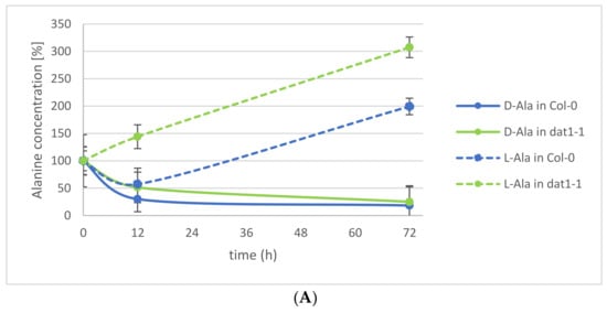 Another possibility of d-Ala and d-Glu reduction in our experiments is d-AA-specific transamination, as implied in previous studies. Previously, it was found that almost all d-AAs are converted into d-Ala and d-Glu; also both d-AAs into each other []. In a follow-up report [], the Arabidopsis accession Ler was found to be unable to perform this conversion. Later, it was shown that a defective DAT1 protein in this accession is responsible for this effect, which leads to the loss of this major determinant in plant d-AA metabolism []. In Figure 2A,B, it can be seen that reduction of the tested d-AAs does not differ between the wild-type and the dat1 mutant. This shows, at least, that plants possess alternatives to DAT1-catalyzed transamination with comparable capacity to metabolize d-AAs, which await to be unraveled.
