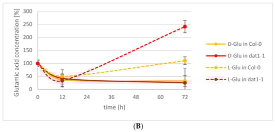 This observation led to the question of which processes may contribute to this d-AA reduction in the plants. Various enzymatic and nonenzymatic processes have been suggested elsewhere []. Among the putative enzymatic metabolizations of d-AAs, we tested the impact of d-AA-specific transamination. Recently, the responsible enzyme for the almost-complete d-AA transamination activity in Arabidopsis could be identified as AtDAT1 [], an enzyme which had been characterized as a d-Asp transaminase before []. The loss of this enzyme leads to the inability of the plants to convert any d-AA into d-Ala and d-Glu, as it has been observed for the Arabidopsis accession Landsberg erecta (Ler) [,]. To analyze the portion of transamination in the reduction of d-Ala and d-Glu in seedlings, Arabidopsis Columbia-0 (Col-0) wild-type and a dat1 mutant line (dat1-1) were treated with both d-AAs as described above, and their Ala and Glu contents were determined for 72 h. These analyses revealed that the reduction of d-Ala and d-Glu is not different between both tested lines over the observed time. Instead, the content of the corresponding l-enantiomer of the applied d-AA increases significantly (Figure 2A,B). This implies the involvement of racemases in the reduction of d-Ala and d-Glu levels.