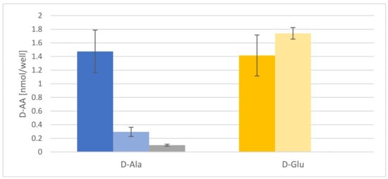 Another possible mechanism for d-AA reduction to be tested was rhizodeposition []. It is a well-established fact that plants release proteinogenic AAs into their rhizosphere [], but the root exudation of d-AAs has not been reported before. Therefore, Arabidopsis seedlings were fed with d-Ala and d-Glu, washed, and then transferred to fresh media. These media were then analyzed after 12 and 72 h. The results of these experiments are presented in Figure 3. In both cases, there is a comparable release of both d-AAs to the medium, which is significantly higher than in the untreated control samples. It is noteworthy that the d-Ala concentration in the medium decreases significantly after 72 h, whereas d-Glu stays almost constant.