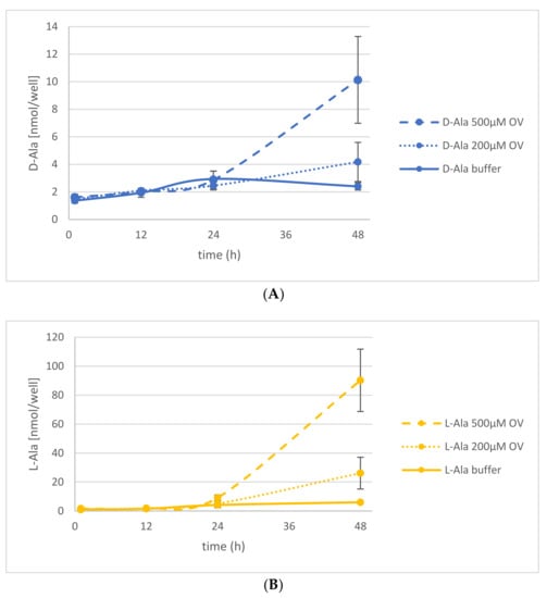 The observation of d-AA exudation into the rhizosphere led to the questions of if this process is comparable to the exudation of l-AAs and how it is energized. It has been shown before that l-AA exudation is related to ATP hydrolysis by ATP binding cassette (ABC) transporters [,]. To find out if this also holds true for d-AA exudation, seedlings were treated with d-Ala and afterwards transferred to fresh media with Na-orthovanadate (OV) or carbonyl cyanide 3-chlorophenylhydrazone (CCCP). The analysis of the AA composition in the medium after treatment with 200 and 500 µM OV, an inhibitor of ATP hydrolysis, revealed an increase of d-Ala exudation over time compared to the untreated control plants (Figure 4A). In the same time, the d-Ala content within treated and untreated plants decreased comparably (Figure S1A). The release of the corresponding l-enantiomer into the medium also increased upon OV application even to a greater extent (Figure 4B). In contrast to d-Ala, the l-Ala concentration in the plants rose with increasing OV concentration (Figure S1B).