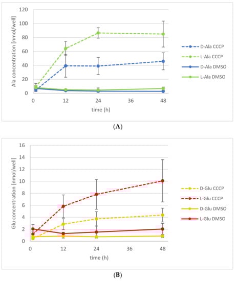 Application of another ABC transporter blocking agent, CCCP, which causes the dissipation of proton gradients, also led to an increase of d-Ala and l-Ala exudation (Figure 5A). As observed before with OV application, the d-Ala content in the plants decreased too, whereas the l-Ala remained almost constant (Figure S2A). Additionally, it has been shown before that application of d-Ala leads to the accumulation of d-Glu in the plant []. Thus, the exudation of d- and l-Glu could also be analyzed without external application. There was an increased exudation of d-Glu observable, as well as of its l-enantiomer, after the application of d-Ala (Figure 5B). There were no significant changes observed of the Glu levels in treated and untreated plants (Figure S2B).
