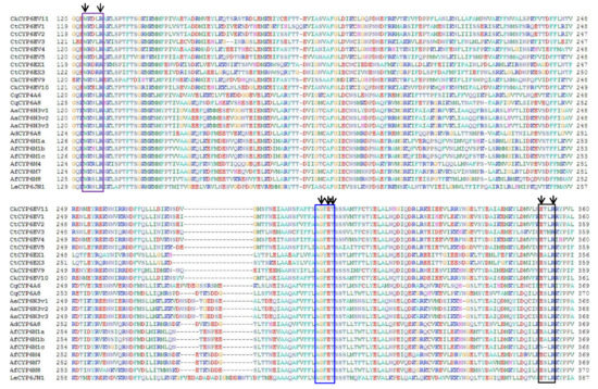The alignment of deduced amino acid sequences from 23 CYP genes from seven insects. The five important conserved motifs of the CYPs were framed by only partial sequence alignment. The purple box shows helix-C with conserved sequences WxxxR; blue box indicates helix-I with typical sequences AGxET; and dark box highlights helix-K with sequences E/SxLR. The heme-binding domain is boxed in pink with typical residues FxxGxxxCxG/A and the conserved Meander domain was boxed in red with conserved sequences PxxFxPxxF. The similarity of CYP6EV11 with CkCYP6EV10, CtCYP6EV4, CtCYP6EV5, CkCYP6EV9, CtCYP6EV2, CtCYP6EV3, CtCYP6EV1, CtCYP6EX3, AfCYP6M8, CqCYP6A8, AfCYP6M4, AdCYP6A8, AaCYP6N3v3, AaCYP6N3v2, AaCYP6N3v1, AfCYP6M7, CqCYP4A6, AfCYP6M1b, AfCYP6M1a, CtCYP6EX1, LeCYP6JN1, AfCYP6M1c is 71%, 64%, 63%, 61%, 58%, 56%, 56%, 47%, 43%, 44%, 44%, 43%, 42%, 41%, 42%, 43%, 42%, 45%, 45%, 44%, 41%, 44%, respectively.