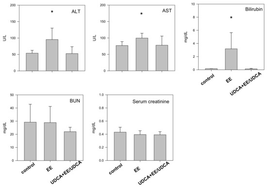 Biochemical parameters such as alanine aminotransferase (ALT), aspartate aminotransferase (AST), bilirubin, blood urea nitrogen (BUN) and serum creatinine level in control, EE and UDCA + EE/UDCA group. Each bar represents the mean ± SD from three different rats per group. * p < 0.05, significant compared with control group by student’s t-test.