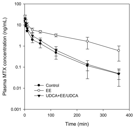 Plasma concentration-time profile of methotrexate (MTX) in control, EE and UDCA + EE/UDCA groups following intravenous injection of MTX at a dose of 3 mg/kg. Data point represents the mean ± SD from three or four different rats per group.
