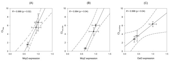 Regression analysis was performed to elucidate the correlation between the changes in the expression of transporters (western blot results) and in vivo kinetics of MTX (in vivo clearance parameters). As shown in Figure 5A, Mrp2 protein expression in the liver was closely correlated with the in vivo biliary clearance (CLbile) (Figure 5A, R = 0.999, p = 0.02). Similar correlation was found for Mrp2 expression in the liver and biliary excretion clearance (CLexc,bile) of MTX (Figure 5B, R = 0.994, p = 0.04). These results strongly suggest the involvement of Mrp2 expression in the modulation of hepatobiliary excretion of MTX. However, no significant correlation was observed between Mrp2 expression and other parameters of in vivo MTX clearance (CLup,liver, CLurine and CLexc,urine), suggestive of the absence of any association between Mrp2 and the process of hepatic uptake or urinary excretion of MTX. On the other hand, the renal expression of Oat3 was significantly correlated with CLup,kidney of MTX (Figure 5C, R = 0.998, p = 0.04), indicative of the involvement of Oat3 expression in the modulation of renal uptake of MTX [31,32].