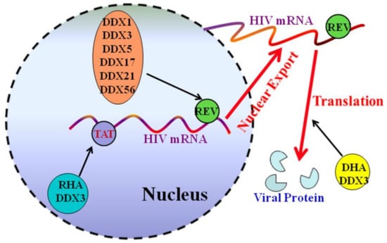 As the causative agent of acquired immune deficiency syndrome (AIDS), human immunodeficiency virus 1 (HIV-1) is a retrovirus of the lentivirus genus with an RNA genome of ~9 kb. Nine polypeptides are encoded by the genome RNA, containing three structural proteins Env (envelope), Gag (group-specific antigen), and Pol (polymerase); four accessory proteins, Nef, Vif, Vpu, and Vpr; and the regulatory proteins, Tat and Rev [46,47]. This “intelligent” pathogen utilizes many host cell factors for its replication. Genome-wide screening technologies have been applied by many groups to clarify host factors that affect HIV-1 replication. More than 300 cellular factors have been identified that may be involved in this process [48,49,50]. Among these factors, several members of the DEAD-box helicase family that act as co-factors to facilitate HIV-1 proliferation, such as RNA helicase A (RHA), DDX1, DDX3, DDX5, DDX10, DDX17, DDX21, DDX28, DHX36, DDX47, DDX52, and DDX56 [17,49,51,52,53,54,55]. Research has revealed that host RNA helicases RHA and DDX3 act as cofactors of Tat and enhance HIV-1 genes expression [56,57,58]. Knockdown of DDX3 expression or depletion of DDX3 in cells effectively suppresses the translation of Tat and Rev as well as HIV-1 mRNA transcription [57,58]. DDX3 directly interacts with HIV-1 Tat, which is partially targeted to cytoplasmic stress granules upon DDX3 overexpression or conditions of cell stress, suggesting a potential role of Tat/DDX3 complex in translation. More findings have indicated that DDX3 is recruited to the trans-activation responsive (TAR) hairpin by interaction with viral Tat to facilitate HIV-1 mRNA transcription and translation [57,58].