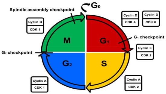 The cell cycle is divided into interphase and mitosis []. During interphase, cell growth and DNA synthesis occur to prepare the cell for mitosis []. Interphase consists of the growth 1/gap 1 (G1) phase, the DNA synthesis (S) phase, and the pre-mitotic/gap 2 (G2) phase, while mitosis comprises the mitotic (M) phase []. In the M phase, mitosis is marked by nuclear division and cytokinesis (cytoplasmic division) [,]. In the G1 phase, cells are metabolically active and grow continuously [,]. DNA synthesis and replication occur during the S phase [,]. During the G2 phase, cells continue to grow and specific proteins are synthesized in preparation for mitosis [,]. The resting (G0) phase signifies quiescence in which non-dividing cells exit the cell cycle [,].