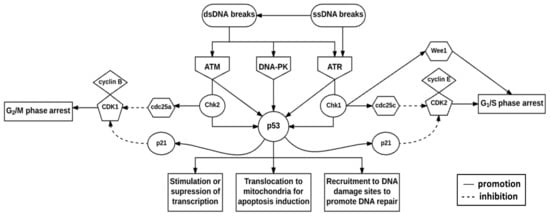 The DNA damage checkpoint complex is composed of sensors, signal transducers, and effector pathways []. The fundamental components are the phosphoinositide 3 kinase-related kinases (PIKKs), namely ataxia telangiectasia mutated (ATM), ataxia telangiectasia, and rad3-related (ATR) and DNA-dependent protein kinase (DNA-PK) (Figure 2) [,]. These proteins play vital roles in telomere-length regulation to protect chromosome ends from deterioration and in the prevention of their ends fusing with other chromosomes [,]. Additionally, the substrates of these proteins, such as Chk1 and checkpoint kinase 2 (Chk2), mediate cell cycle arrest in the G1, S, and G2 phases of the cell cycle, thus mediating DNA repair and cell death [,].